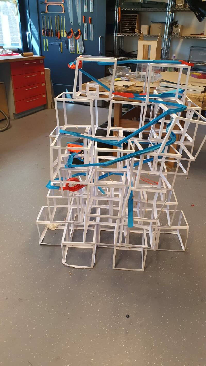 Hier hebben we een Papertrack gemaakt ik heb het einde bijna afgemaakt ik had het gemaakt met Rayan, Quinlan en Aditya. We hebben het gemaakt met papier, plakband en lijm. Het laatste stukje moet nog gemaakt worden. Ik heb twee foto's gemaakt, eentje toen we begonnen en eentje van het einde.